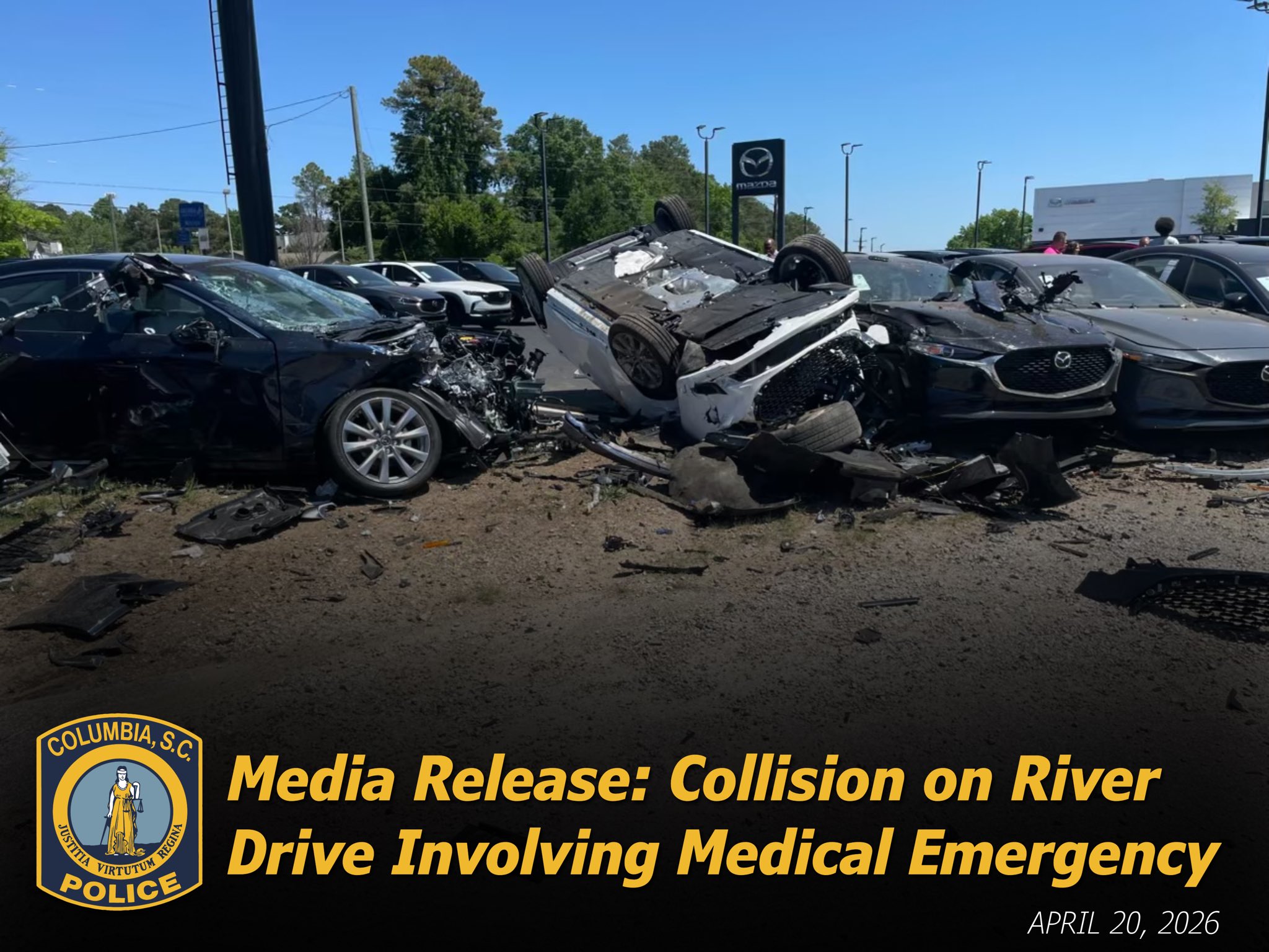 The medical emergency caused her to leave the roadway and strike multiple vehicles on River Drive near a local Mazda dealership.