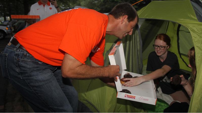 Clemson head football coach Dabo Swinney has handed out donuts and given pep talks to students camping out for tickets to the UGA game.