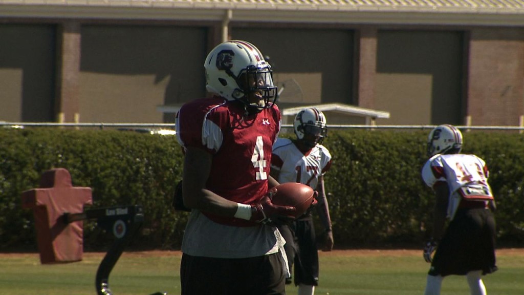 The University of South Carolina football squad weathered a cool and windy day as they conducted spring practice number four of 15 at the Bluff Road practice fields on Thursday afternoon. “It was a cold and windy day,” acknowledged head coach Steve Spurrier. “We cut back a little bit. But (sophomore wide receiver) Shaq Roland had the best practice he’s had I think since he’s been a Gamecock. He was catching everything, running full speed.”