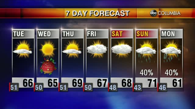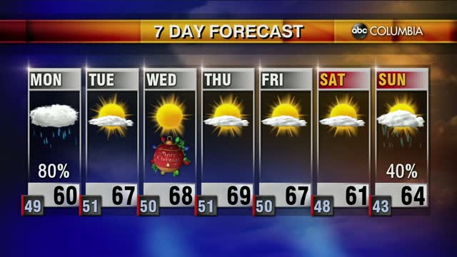Look for plenty of clouds on Saturday, but the rain will hold off until late on Sunday. Skies clear for Christmas Eve and Christmas Day will be sunny and warm with highs climbing well into the 60’s. Categories: Todays Forecast Tags: ABC Columbia Forecast
