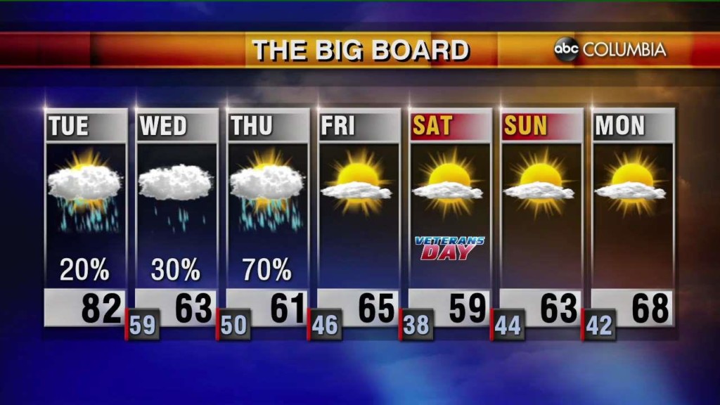 Get ready for some drizzly gloom for Wednesday with highs only in the 50’s. More active rain arrives on Thursday. Brighter Friday. And a nice Veteran’s Day Weekend on tap. Categories: Todays Forecast Tags: ABC Columbia Forecast