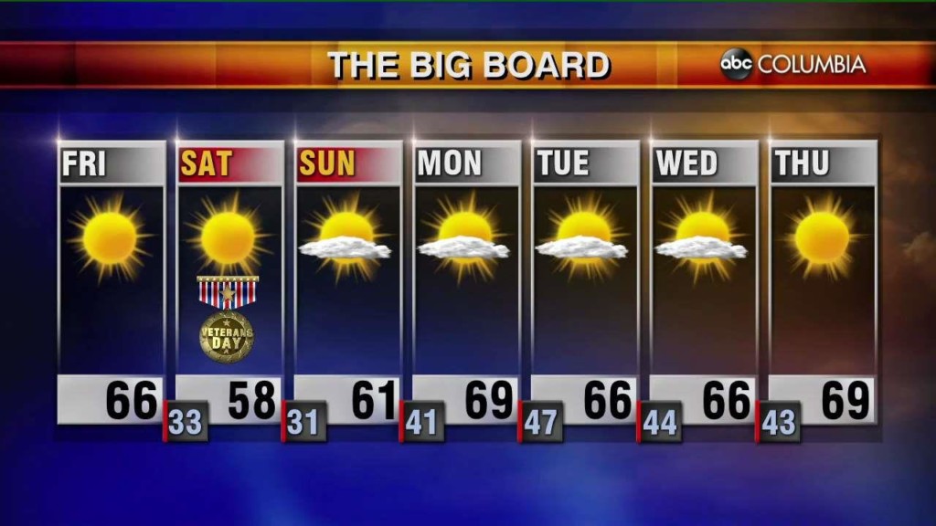 Sunshine returns on Friday with highs in the mid 60’s. Look for near-freezing nights over the weekend with afternoon highs near 60. Categories: Todays Forecast Tags: ABC Columbia Forecast
