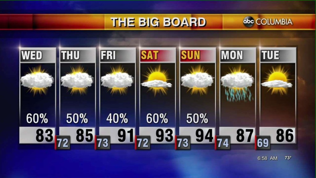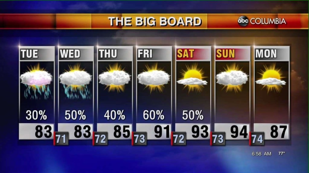 Plan on lots of clouds with on & off showers – especially late in the day on Tuesday. Wednesday will be cloudy, but won’t have as many showers. By the weekend, it’s back to the typical summer pattern with sunny skies, warm temperatures and some scattered late storms. Categories: Todays Forecast Tags: ABC Columbia Forecast